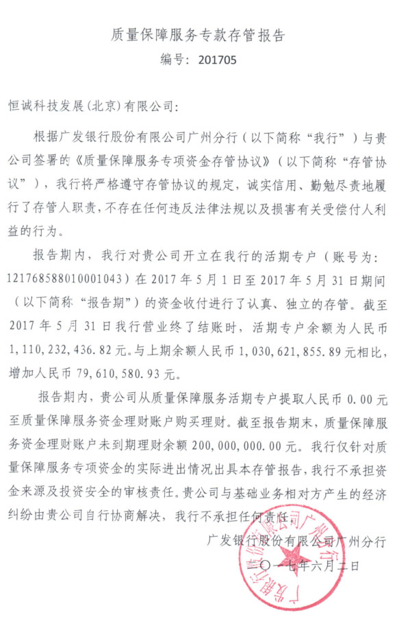 2017年5月 宜人贷质保服务专款存管报告