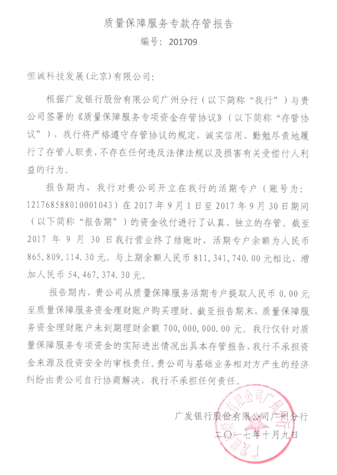 为更好的保护网络金融消费者权益,提高质量保障服务专款缴存额与宜人贷平台提供相应服务的匹配度,自2017年7月1日起,宜人贷改进质量保障服务专款缴存规则。平台将根据在宜人贷平台选择质保服务的出借人所对应的借款人交纳服务费的30%作为质保服务费存入质保服务专户,平台将根据借款人按期交纳服务费产生的现金流,在借款存续期间分期缴存。广发银行会继续针对质保服务专户资金的实际进出情况每月出具存管报告,详见本报告附件。